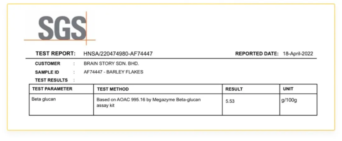 Kandungan Beta Glucan dalam Barley Flakes diuji oleh makmal antarabangsa: SGS. Beta glucan boleh bantu turunkan gula dalam darah dan halang obesiti. Menarik lagi, ia adalah prebiotik. Penting untuk bakteria baik dalam usus.