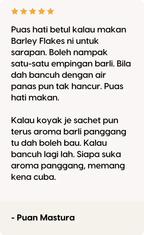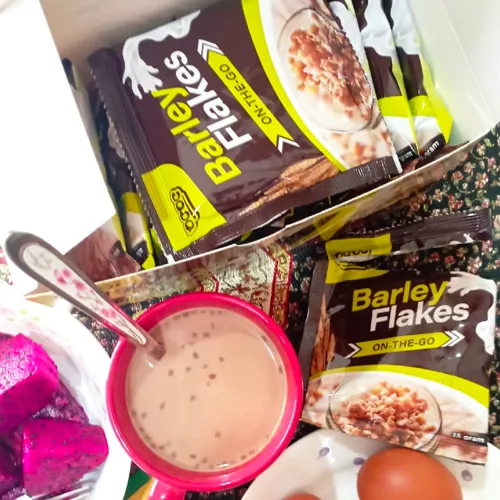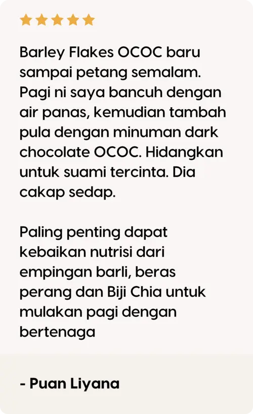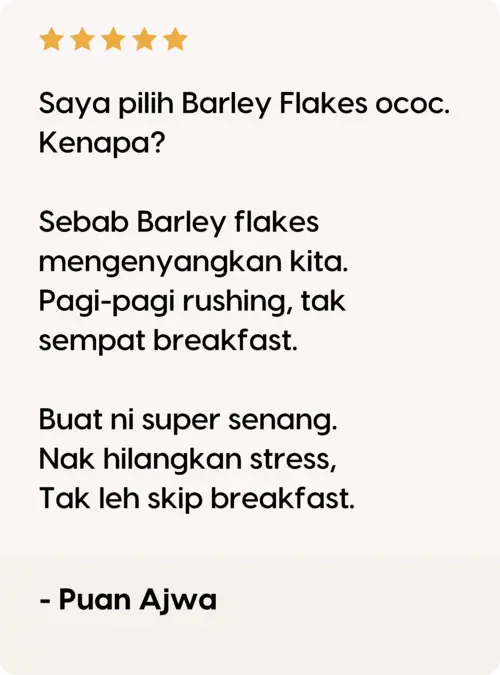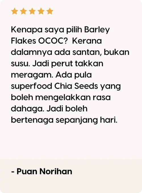 ” Bukan kita orang dewasa aja suka Barley Flakes OCOC ni. Si kecil ni pun suka. Cepat. Mudah. Mengenyangkan. Nampak je semangkuk tapi nutrisi dia bertingkat-tingkat. “
