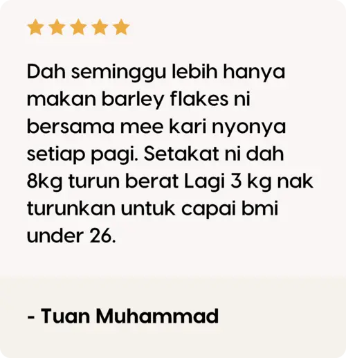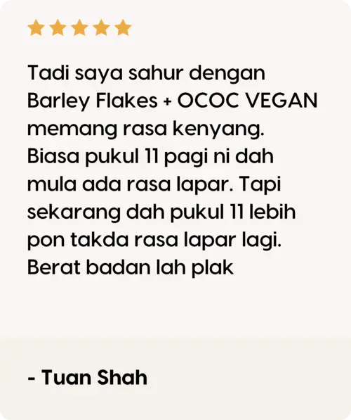 Kajian menunjukkan fiber beta-glucan dalam barley mengurangkan berat badan dan kadar kelaparan. Dan Barley Flakes OCOC tidak menggunakan gula putih. Jadi ia sangat membantu untuk dapatkan badan idaman anda.